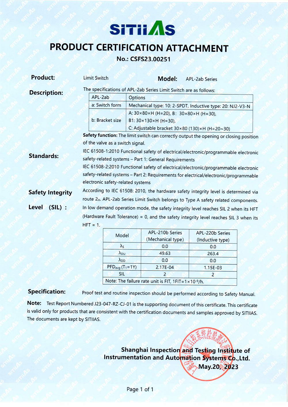 APL-2ab series SIL certificate