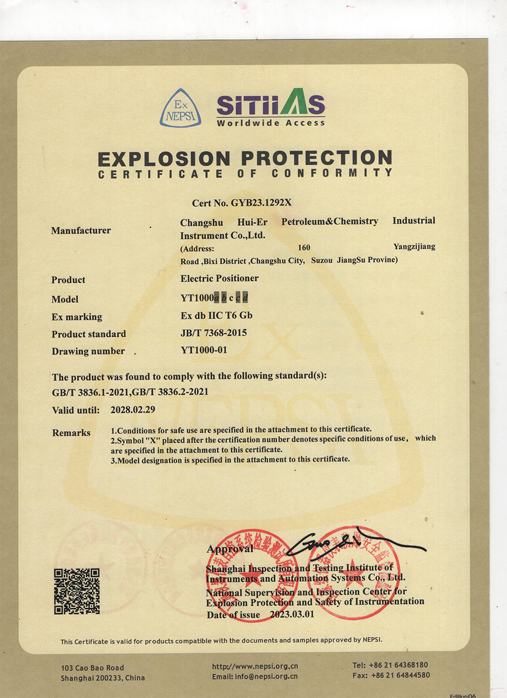 YT1000abccd (Flameproof) Explosion-proof Certificate